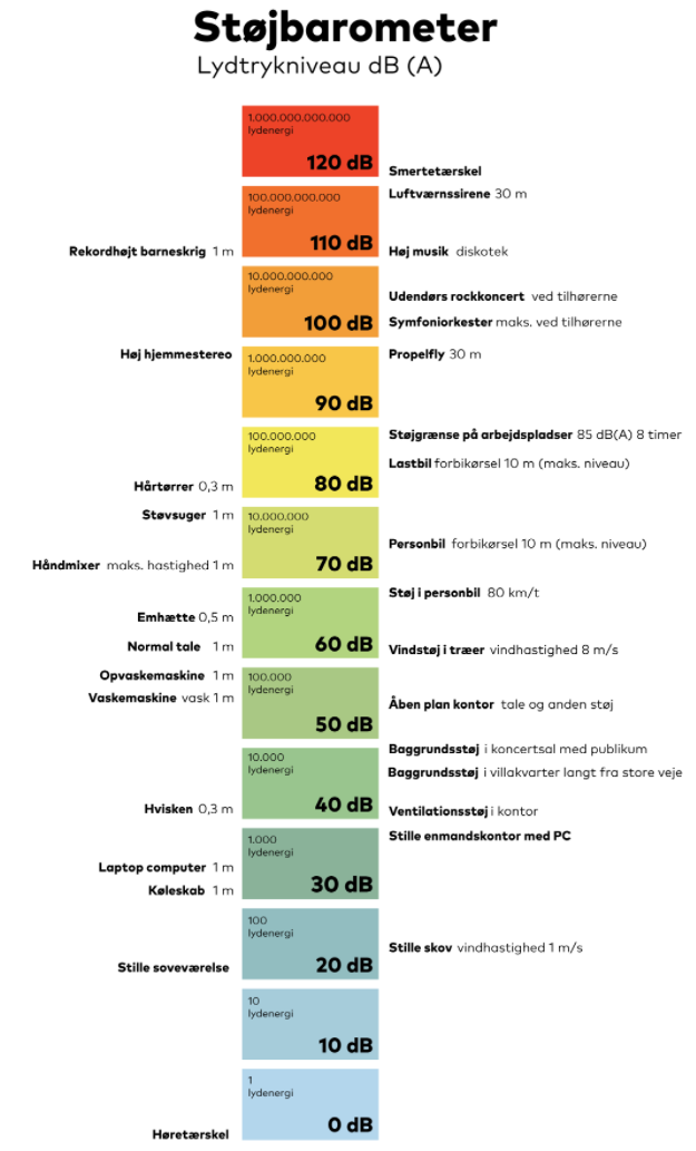 Lyd er den gentagne forplantning af trykbølger gennem luft og måles i decibel, dB. Over hele verden bruges dB(A) – eller decibel (A)-skalaen til lydmålinger. For at få en fornemmelse af skalaen, kan du se tabellen som er vist nedenfor.