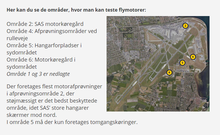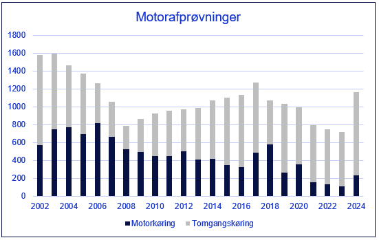 Når et fly og dets motorer har været til service, foretages der efterfølgende en test af flymotorerne. Det kalder man en motorafprøvning. Bliver motoren testet med højere effekt end tomgang, er der tale om en motorkøring. Tilsvarende er en test op til tomgangsydelse en tomgangskøring. Motorstørrelsen varierer fra fly til fly - men helt generelt er en motorkøring mere støjende end en tomgangskøring. Efter der i 2023 havde været udført det laveste antal motorafprøvninger, viser 2024 en kraftig stigning i udførte motor- og tomgangskøringer, hvilket kan tilskrives et generelt øget aktivitetsniveau i CPH. I 2024 blev der udført i alt 1.163 motorafprøvninger fordelt på 236 "fuldpower" motorkøringer og 927 tomgangskøringer.