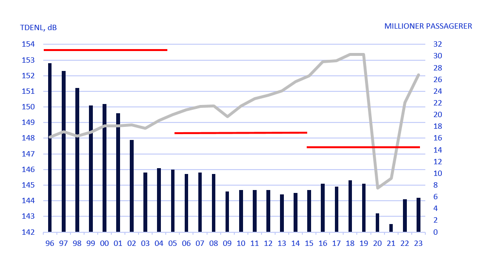 Faldet skyldes primært udfasningen af en række ældre støjende flytyper, der blev endeligt gennemført i 2002. Samtidig med faldet i støjbelastningen er det samlede passagerantal steget.