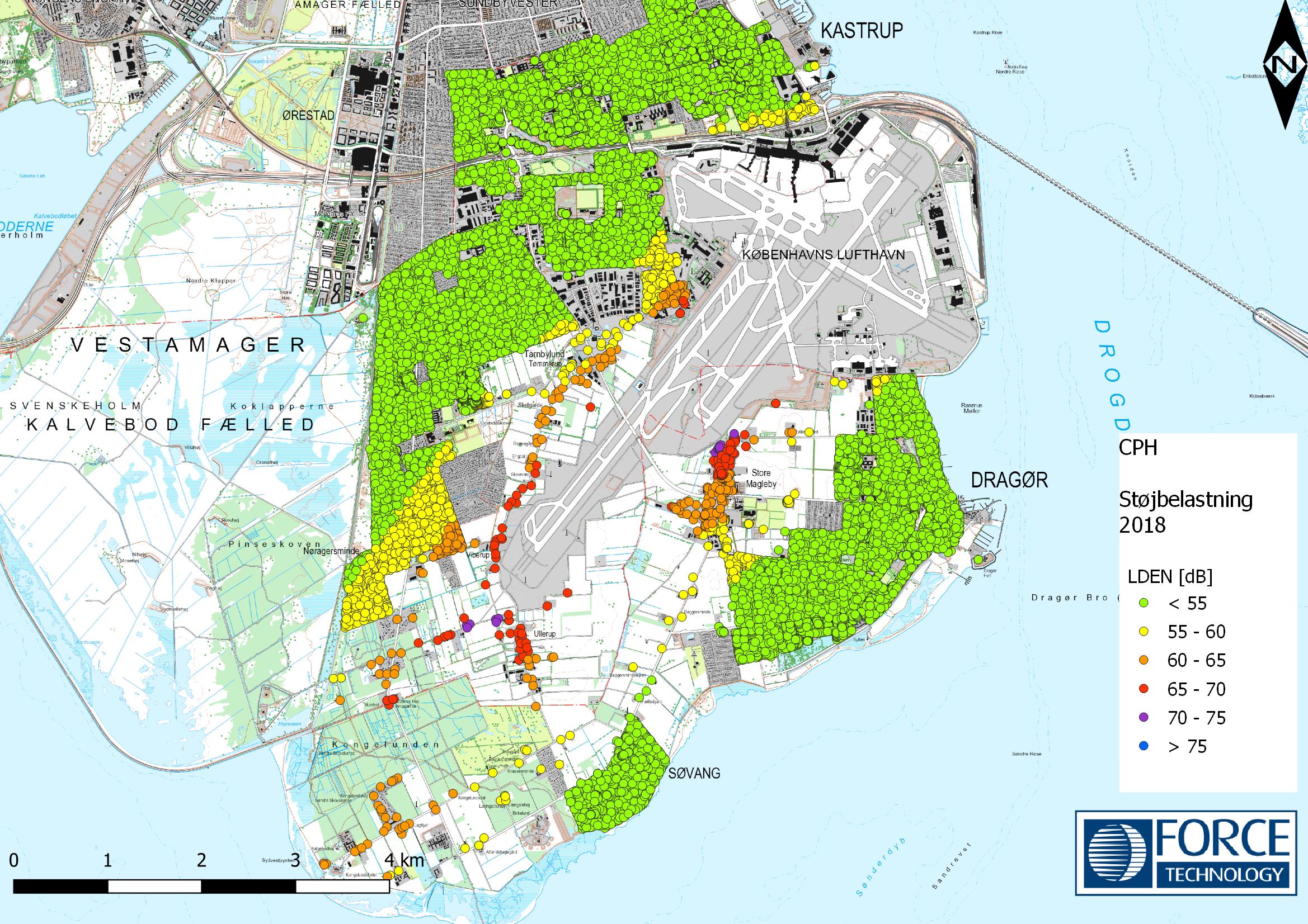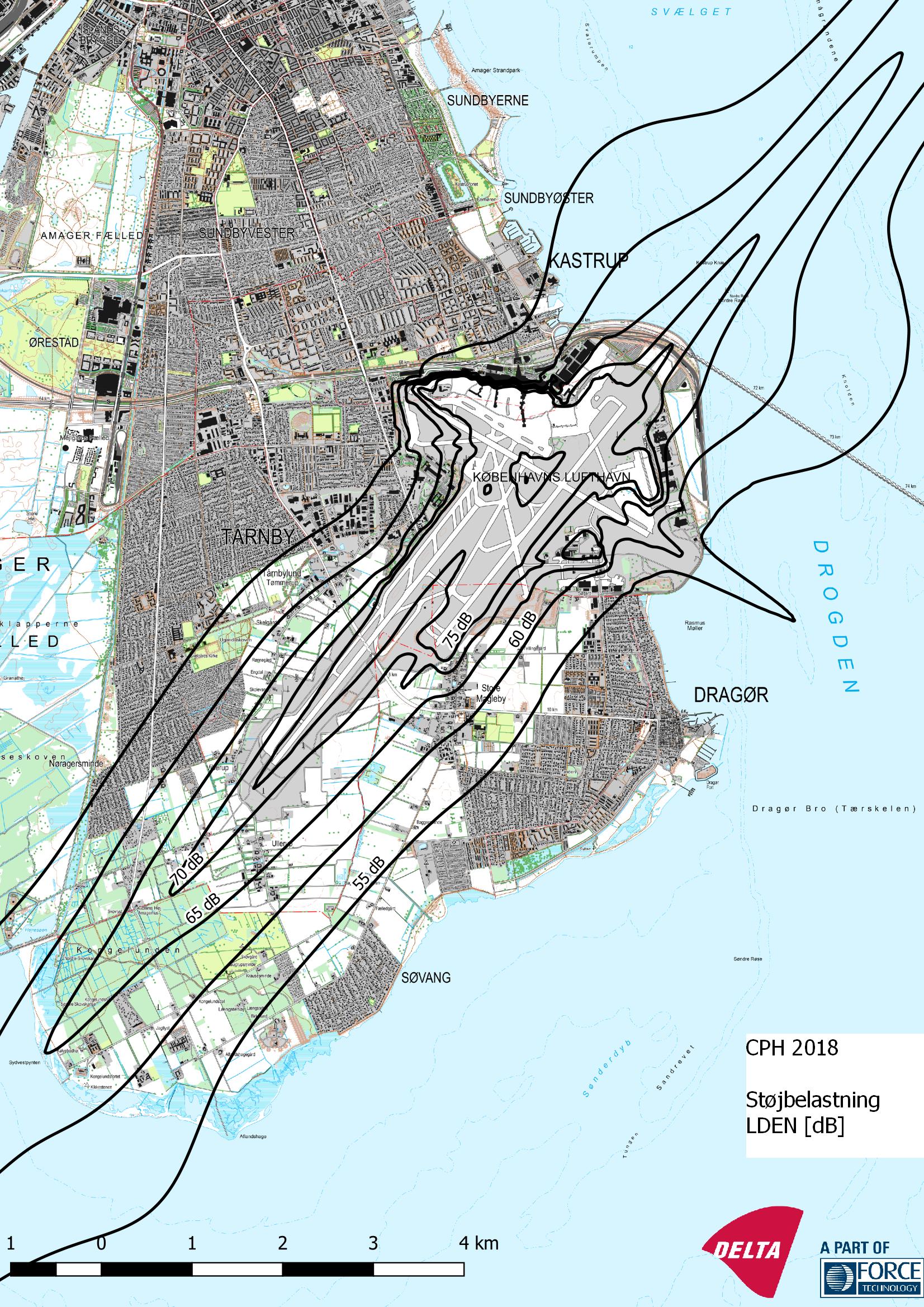 Den samlede støjbelastning, LDEN, fra starter og landinger, inkl. taxikørsel til og fra standplads samt nødvendig brug af APU ved standpladser, beregnes for et gennemsnitsdøgn i de tre mest trafikerede måneder i et givent år.