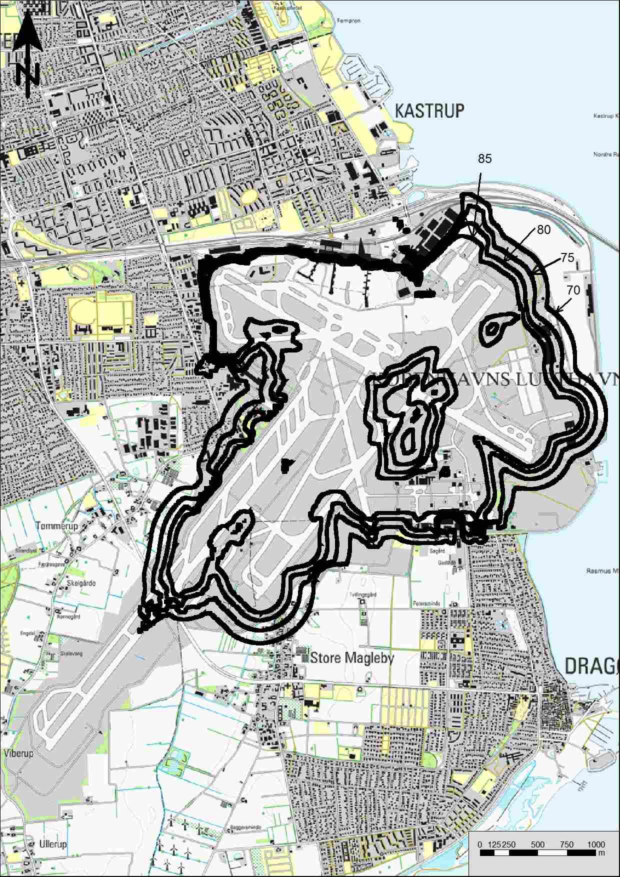 Den sidste kortlægning blev lavet i 2022. Den viste beregningerne af støjens maksimalværdi fra flyenes kørsel mellem terminalerne og landingsbanerne (taxikørsel) i natperioden mellem klokken 23.00 og 06.00 i 2021.
